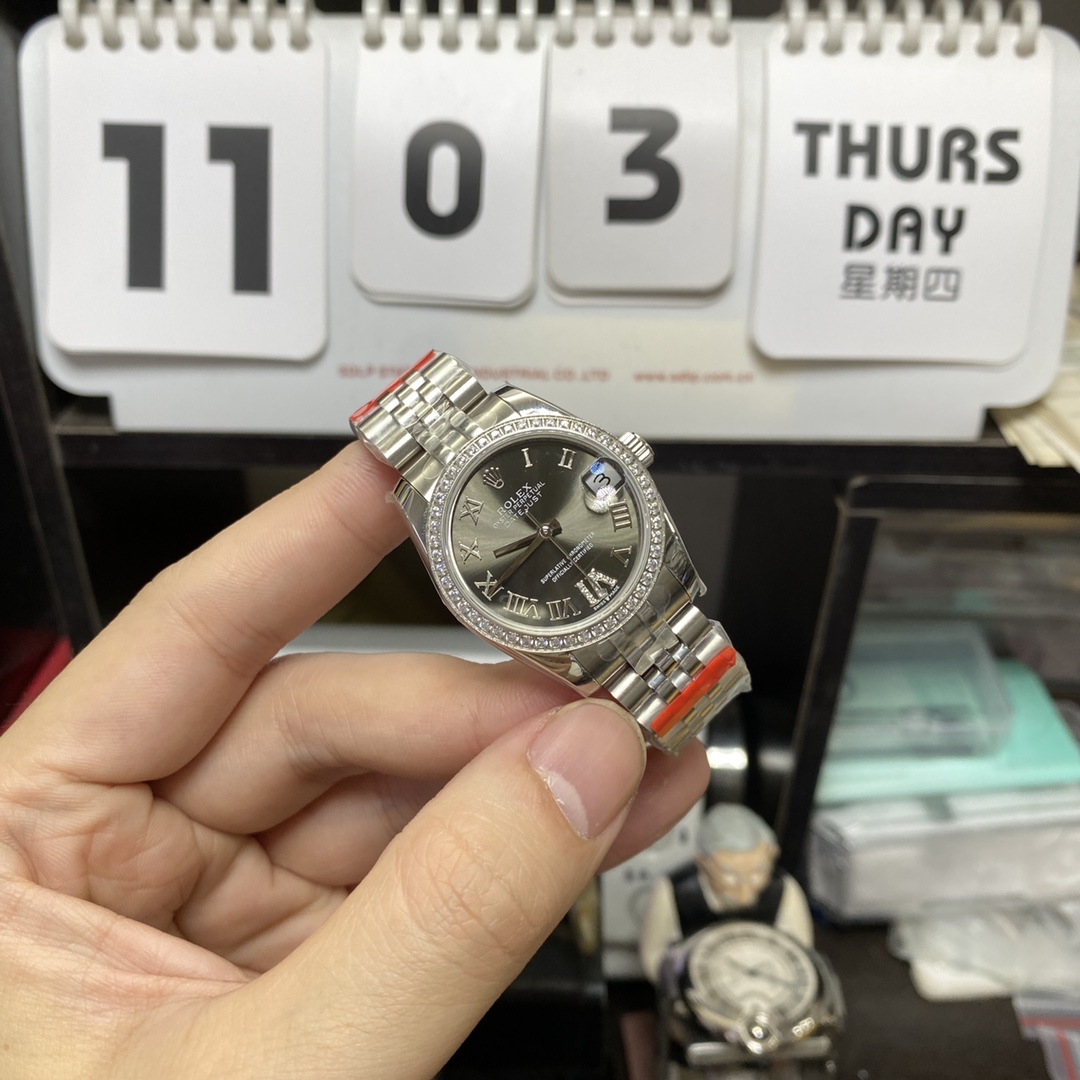 • Rolex Datejust Series m278384rbr-0032, Grey Dial with Diamond Bezel and Roman Numerals, 31mm size, Jubilee stainless steel bracelet.