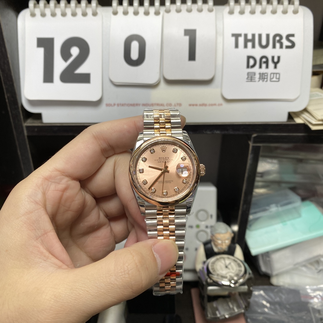 • Rolex Datejust Series  Pink Dial with 18k rose gold case 36mm Size, Five-Link Steel Bracelet.
